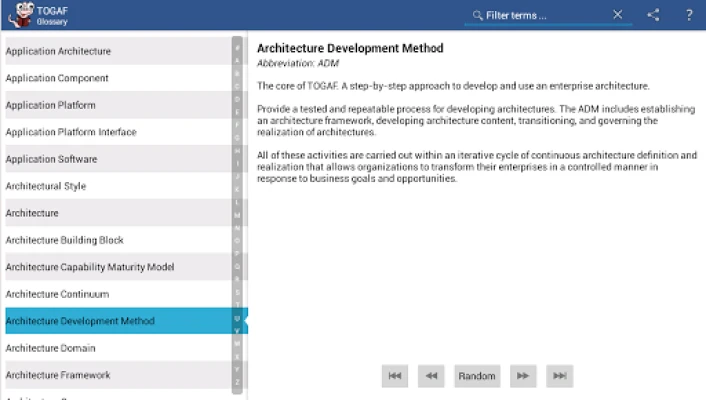 Glossary for TOGAF provides a comprehensive list of definitions for over 400 terms and abbreviation used in TOGAF. It has the following features: