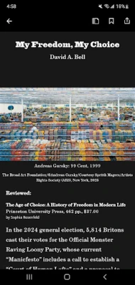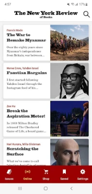 The print edition of The New York Review of Books, included in the app, is published 20 times a year. The app also includes all of our online-only content. Articles can be bookmarked for later reading, and the app includes a link to browse our shop, The Reader’s Catalog.